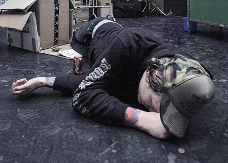 It’s 1:50 pm, and Henrik alias Heinz alias Big Man has just woken up in his bunk in the tour bus. After driving all night while Heinz was asleep, the bus is now totally quiet, parked as it is in front of yet another venue in a new city. Until I showed up and started to take flash photos of him, he was enjoying the tour life and the quiet hangover from the night before.