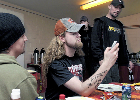 Henrik, one of HateSphere’s two guitarists, is counting aloud the seconds on his cell phone as they approach seven pm. The two ladies running the canteen have told the band not to touch the buffet until it’s exactly seven o’clock. Henrik is not pleased with this – still he’s not heavy metal enough to dare remove the lids from the pots until the digits on his cell phone show nineteen-zero-zero exactly.