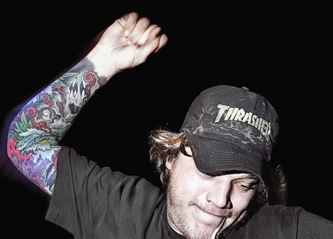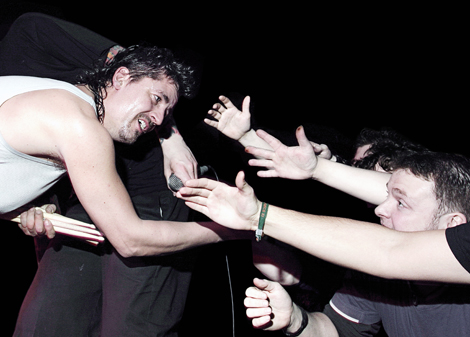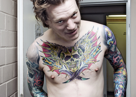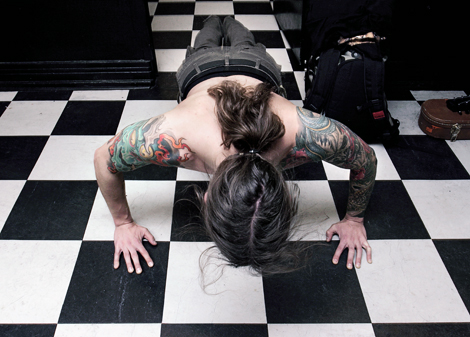 When I arrive at Columbia Club in Berlin where HateSphere is playing that evening it’s three o’clock in the afternoon. I find four of HateSphere’s five members, Anders, Mikael, Henrik and Peter, in the canteen. But the band’s front man, Jacob Bredahl, is missing.
