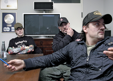 In the meeting room at the SPV headquarters the atmosphere is tense. A couple of representatives of SPV have just mentioned that it may be high time for HateSphere to get a professional manager. Up to now, Jacob has been in charge of the band’s economy and promotion and he’s reluctant to hand over this task to someone else. Besides, the errand boy who’s been sent off to buy the bottle of Jack Daniels that the representatives have promised the boys, is slow to return.