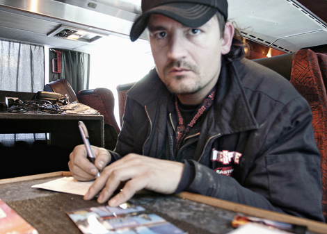Anders, HateSphere’s drummer, has promised himself to write and send 33 postcards to his girlfriend in Aarhus – one for each day he’s away on the tour. But he’s facing a problem. The last three days he has failed to write her, and now he has got three empty postcards that need to be written and sent before the mailboxes are emptied. But he refuses to suffer from bad conscience. “Hey hey and I miss you and kiss kiss,” he says, shrugging impatiently. “A postcard doesn’t need to contain much text”.